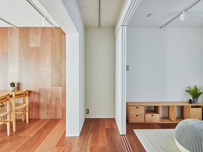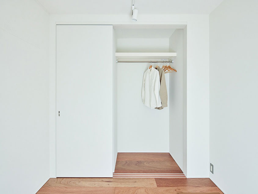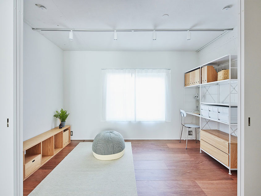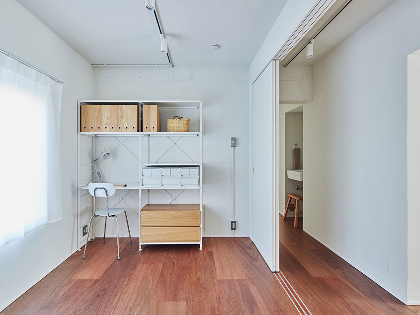 壁式構造の変えられない壁を利用して、個室を設けています。 リビングに面した広めの個室は引戸を開けることで廊下も含めてリビングを延長した空間や、家具収納のあるゆったり寝室に。