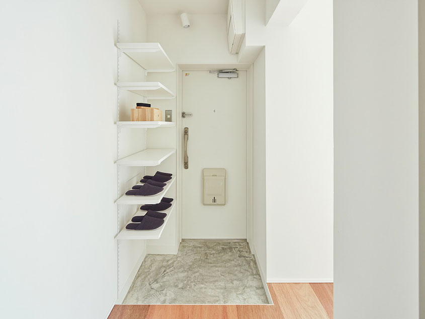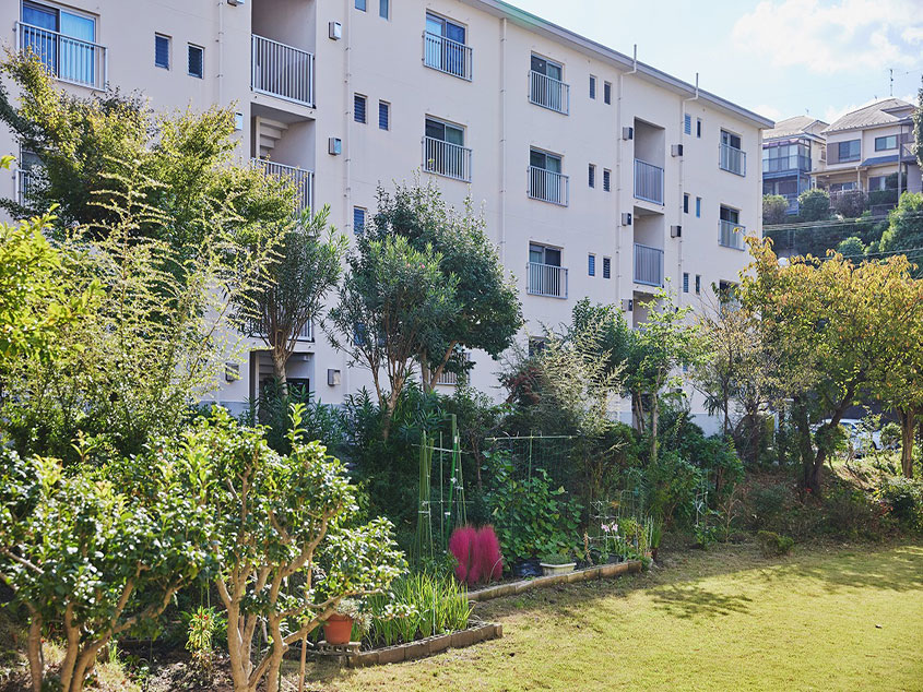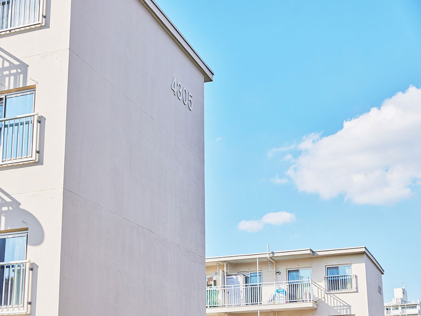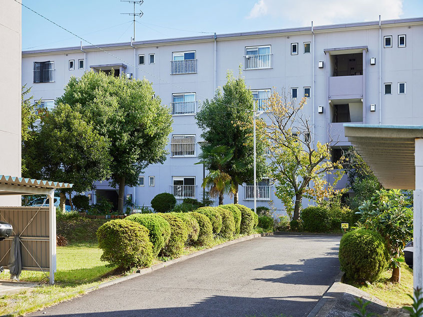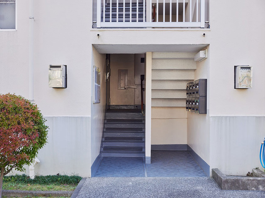 神奈川県横浜市にある竹山団地は、大きな人工池を囲むように作られた、保育園や小学校、スーパーもある大きな団地です。その中で今回リノベーションしたのは、4305棟の1階にあるお部屋。重い荷物がある日でもお部屋まで楽に運び入れられますね。1階ですが階段を数段上る少し高めの場所にあるため、外から室内が見えにくくなっています。