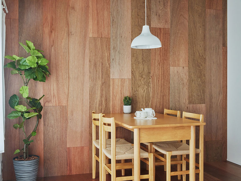 約12畳のリビングダイニングは、ダイニングテーブルを置いても広々。お部屋全体に敷いたMUJI×UR共同開発商品の「ラワン合板フローリング」を、壁にも貼ってアクセントにしました。