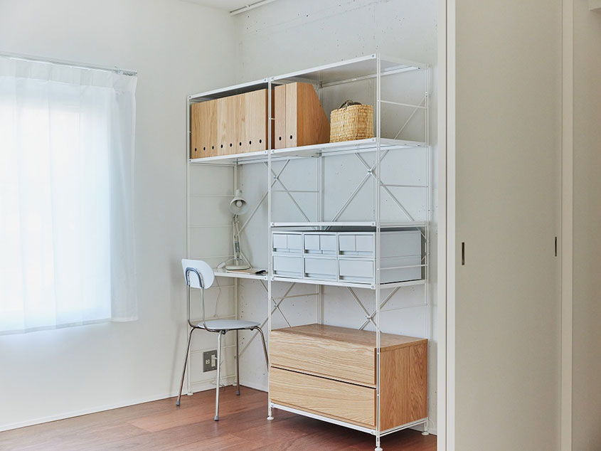 ダイニングの奥にあるキッチンは、壁付けだったものをペニンシュラタイプに変更。外の景色を見ながら料理や洗い物ができます。背面には稼働棚とシェルフがあり、収納力もバッチリです。キッチンと窓の間のちょっとしたスペースは、使い方いろいろ。デスクを置いて小さな書斎にしたり、棚を置いてキッズスペースにしたり……工夫次第で楽しみが広がりますね。