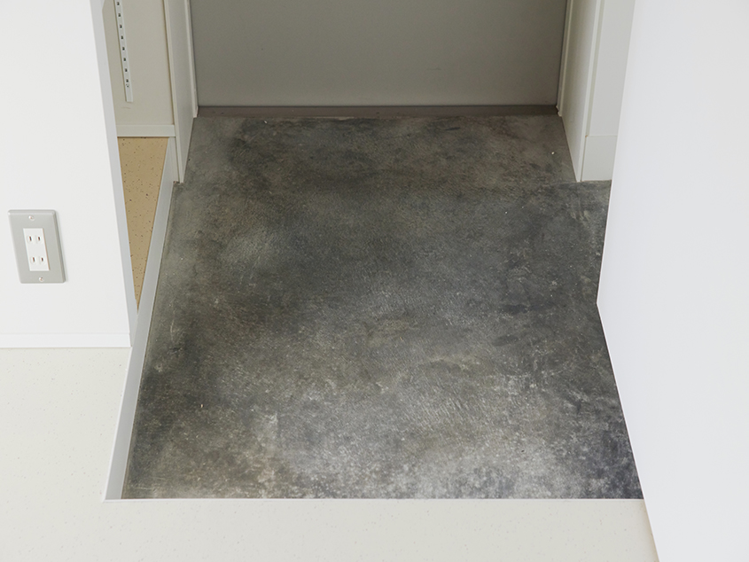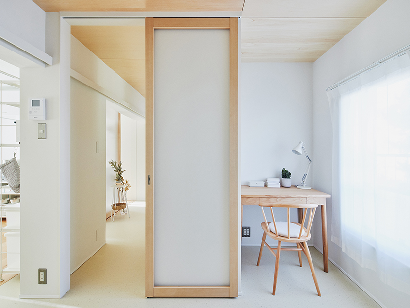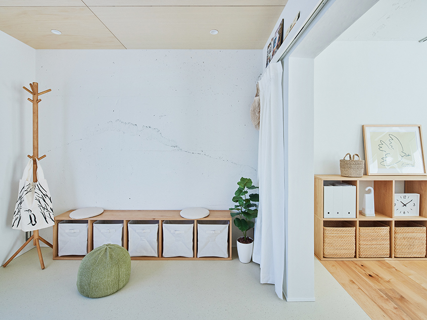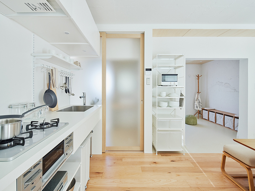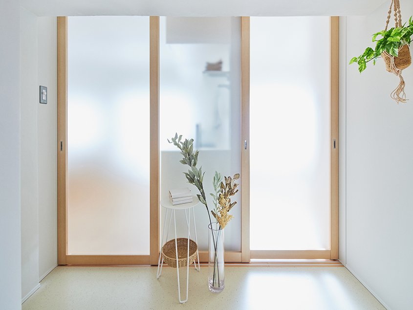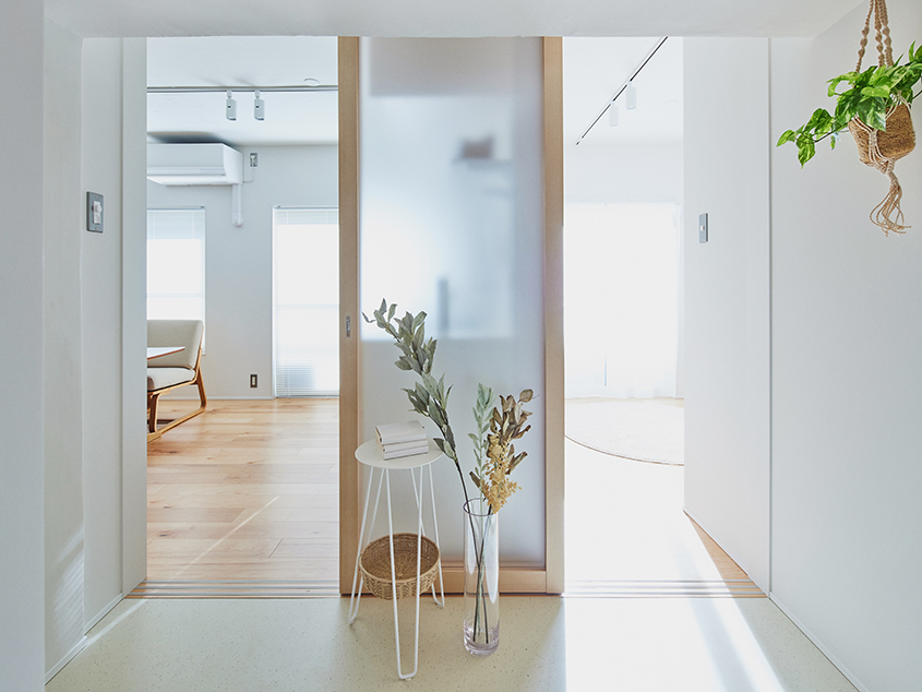 このお部屋の真ん中には玄関から広がるホールがあります。ホールは土間とリノリウム床からなり、半透明の扉ですべての場所へ繋がった、まるで中庭のような存在。団地では玄関が狭くなりがちですが、玄関ホールを広く設けることで開放的な雰囲気を感じさせます。