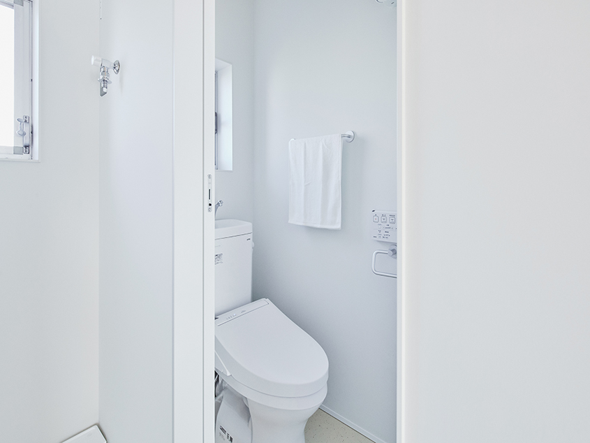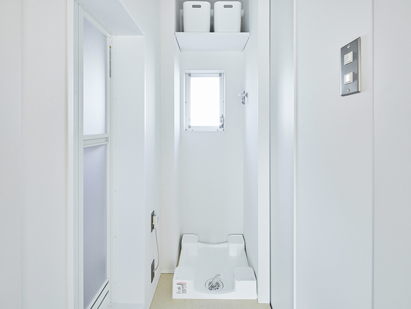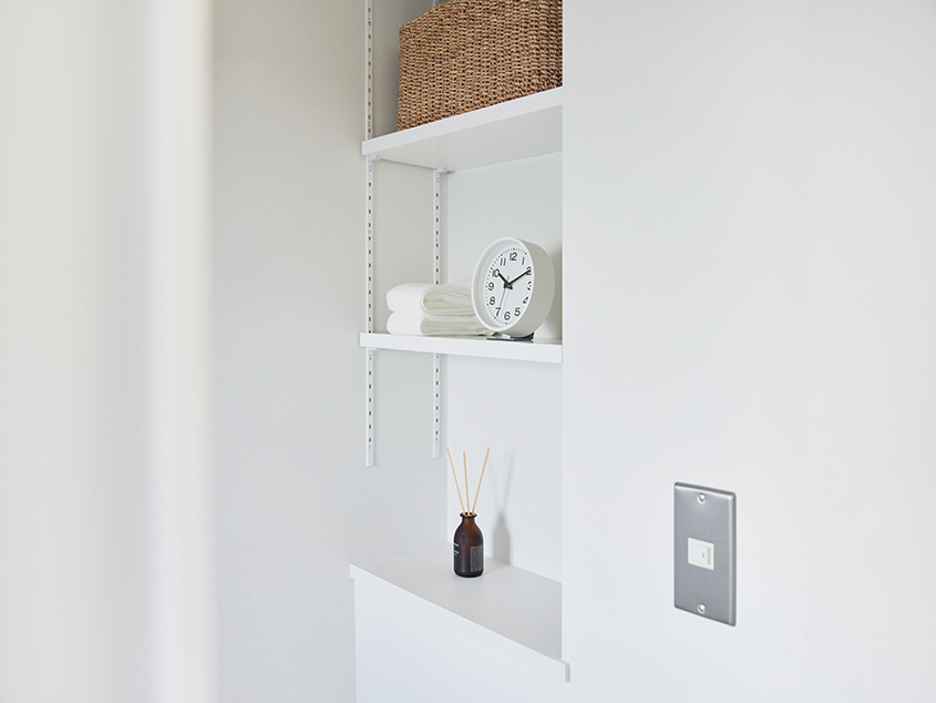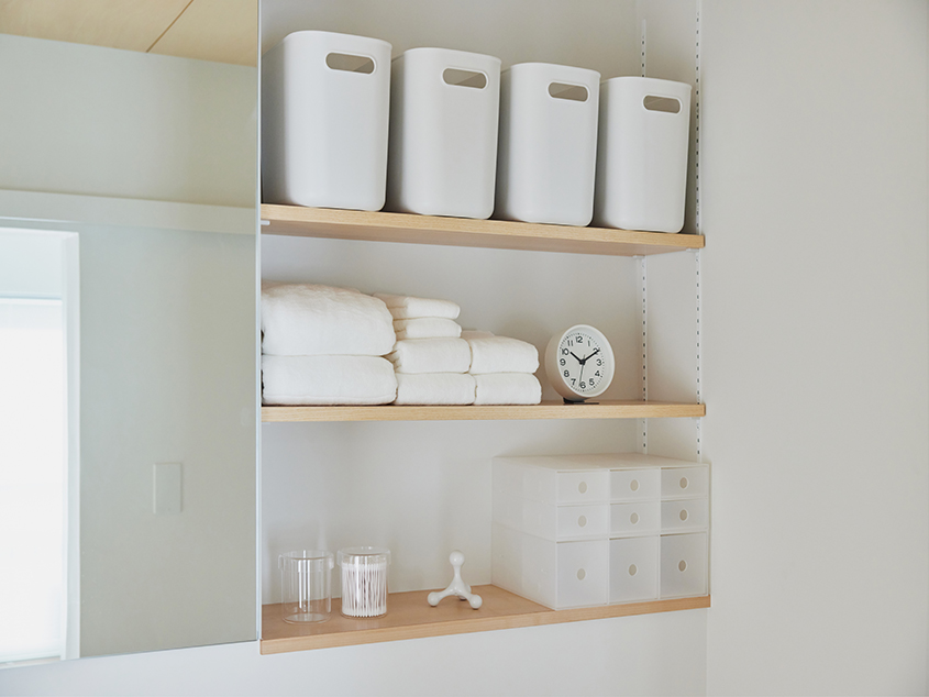 ホール内にある洗面台は、洗面ボウルの左右に広々としたスペースを設けました。スキンケア用品やコスメを並べて身支度をしたり、アイロンがけをしたりもできそう。収納棚もしっかりとってあり、洗剤やボディソープなど水回りストック品も置いておけます。