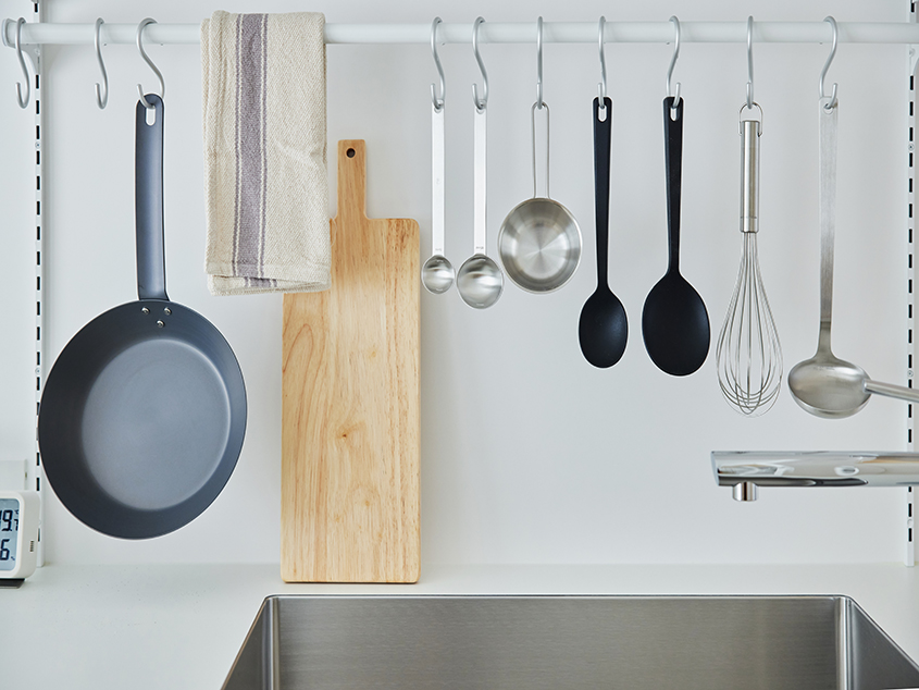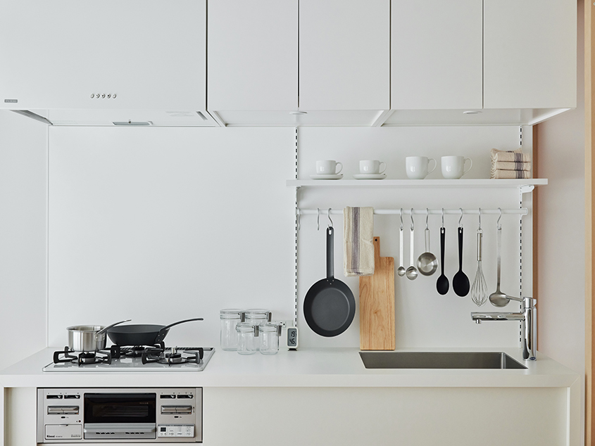 キッチンは壁付けタイプ。吊戸やシンク上の可動棚を設置して、限られたスペースの中でもダイニングを広く使えるようにしています。足元にもラックやワゴンを置いて、収納をカスタマイズしてみてください。