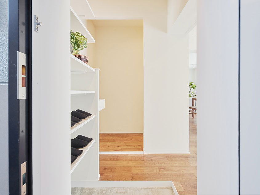 まずは玄関。ホールはコート掛けやベンチを配置することもできる広さを確保した、使いやすいゆったりサイズです。大きめのグリーンを飾るのもいいですね。可動式の下足棚も奥行きがしっかりとあり、靴だけでなく防災用品やお子さんの砂場グッズなども置けそう。玄関の目の前に洗面台を設置することで、帰宅してすぐに手を洗うことができるようにしました。