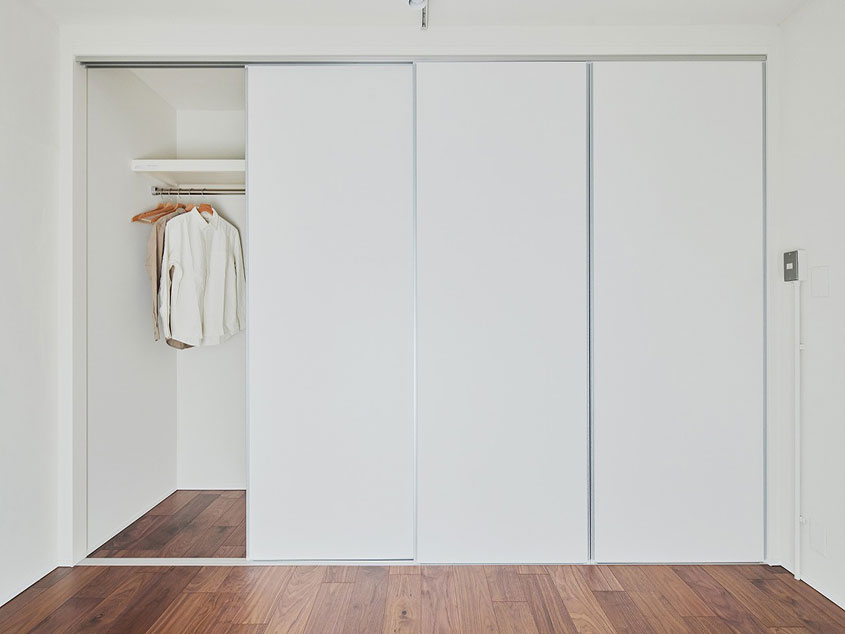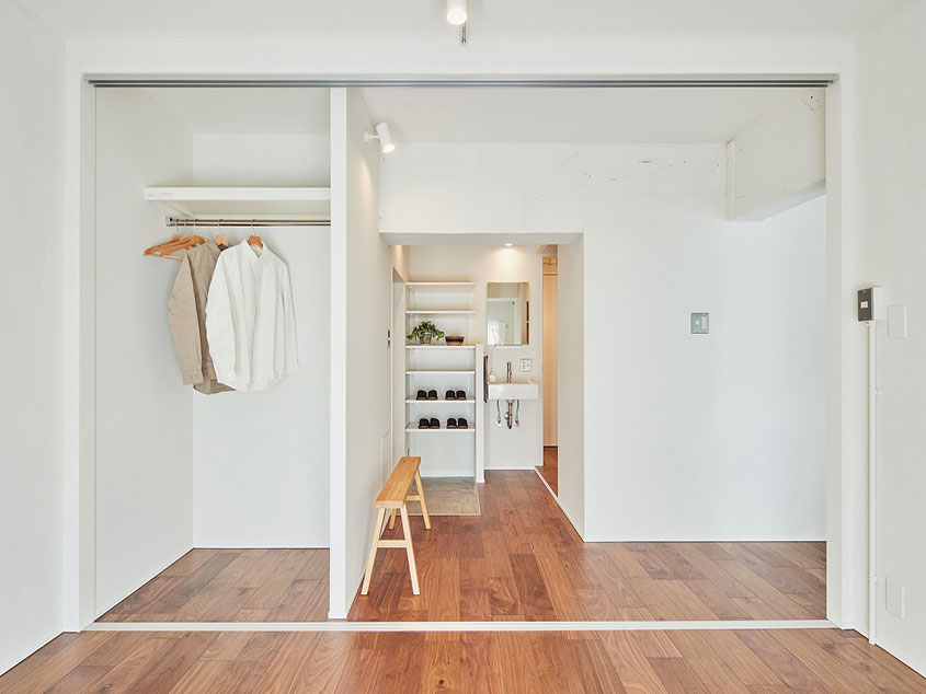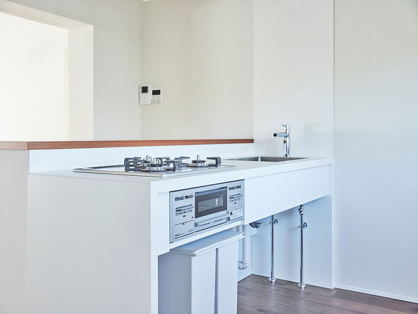 キッチンと隣り合った個室は、引き戸を開けることでさらに開放的な一室空間にすることも可能です。暮らしに合わせて間取りを変えられるお部屋なので、家具や収納も配置次第でさまざまな使い方ができるものがおすすめ。例えば物が増えてきたらキッチンカウンターの下にラックを置いて収納したり、リモートワークが多くなったらデスクを置いて、仕切り代わりの棚を置いたり・・・玄関横には独立した個室もあり、可能性は無限大です。