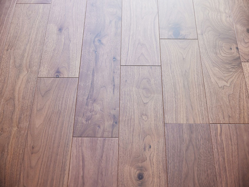 玄関からホールを抜けると、約20畳のダイニングキッチンが広がります。お部屋の床材は高級感のあるウォルナットを採用。シックなブラウンと白い壁で、落ち着いた雰囲気に仕上がりました。