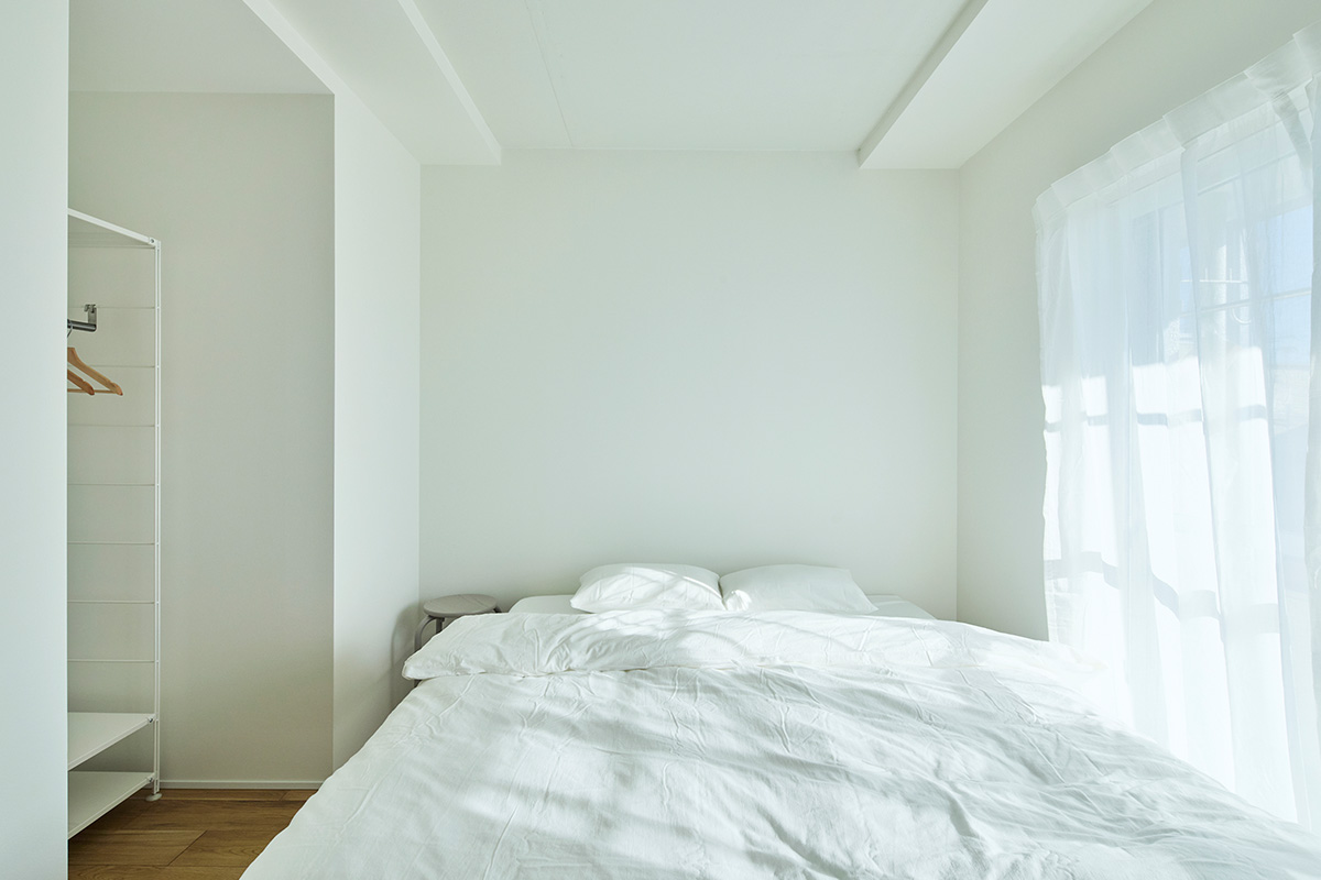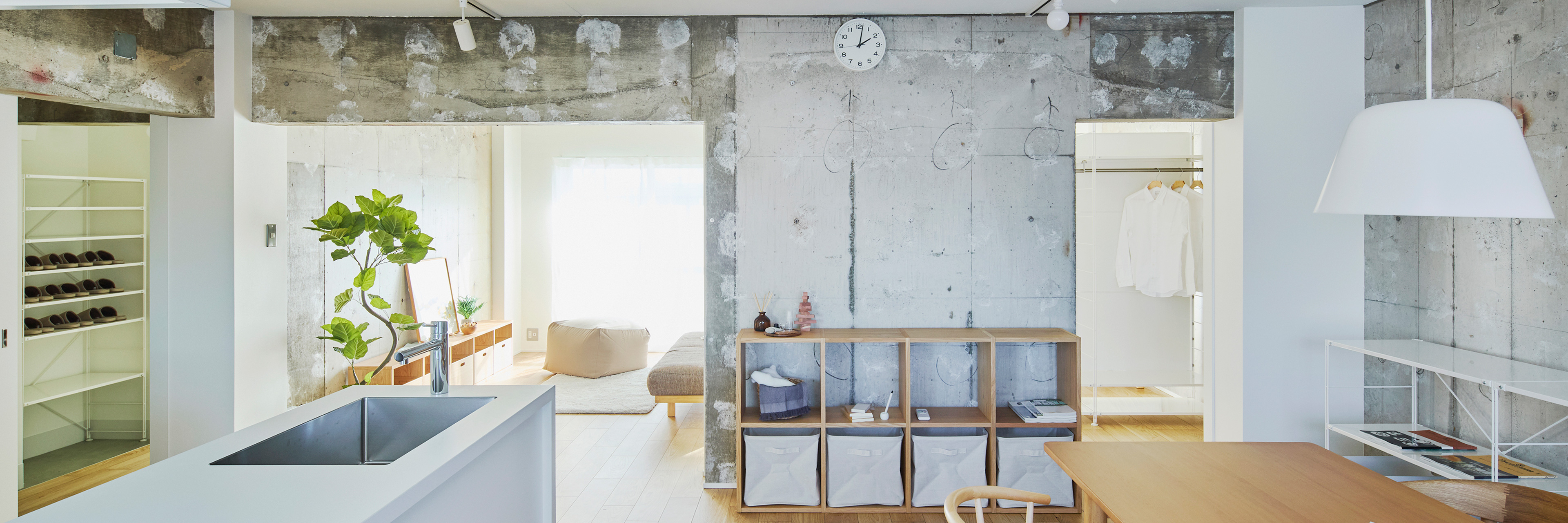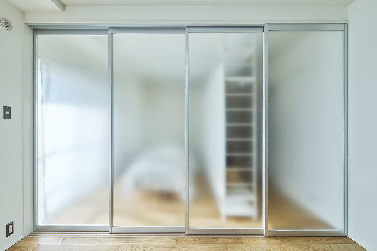 フルスケルト工事を行うことにより壁式構造の躯体壁の位置を確認し、躯体壁を中心に回遊できる広い LDK とアイランドキッチンのあるプランとしました。建具を開け放つことで南北に光と風を通し、2LDKから1LDKの広いLDK空間のある間取りに可変させることもできます。