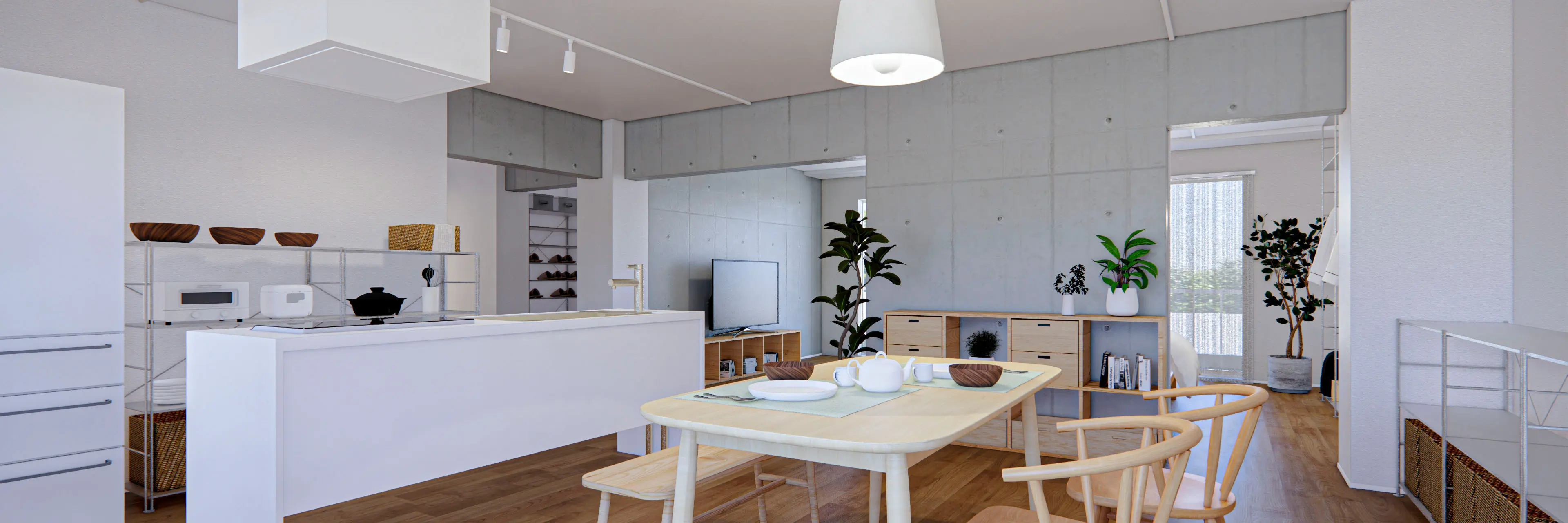 LDK 空間の中央にある引戸を動かすことで、寝室空間を明るい南面に配置したり、北側の落ち着いた場所に配置したり住みながら自由に間取りを可変させることができます。また、キッチンに備え付けのカウンターテーブルを動かして、南北に光と風が通り抜けるロングカウンターキッチンのある暮らしとすることもできます。
