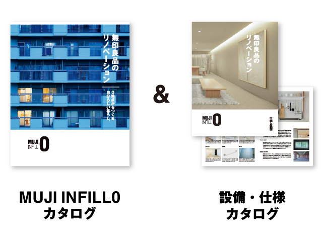 無印良品のリノベーションの特長や施工例などをまとめた「MUJI INFILL0カタログ」と、床や収納、キッチンなど、心地よい暮らしを支えるパーツをまとめた「設備・仕様カタログ」、合計2冊を無料でお届けします。