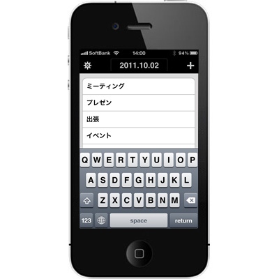 スケジュールを新規作成するには日表示のページをダブルタップ。予定名は「定型文」の中からも選べます。