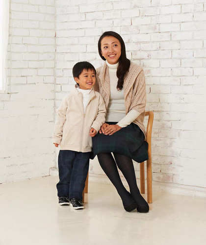 クリーム色にブラックウォッチのボトムスを合わせて、ママとおそろいデート