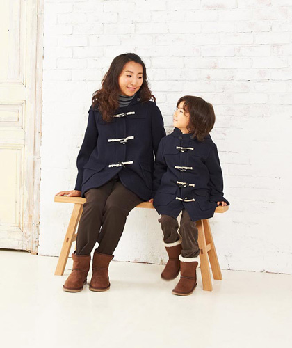 冬のベンチで仲良くおしゃべり。おそろいのダッフルコート、あったかいね