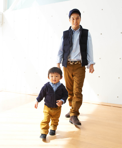 ママがおそろいで選んでくれたカラーパンツの着こなし、パパにだって負けないよ