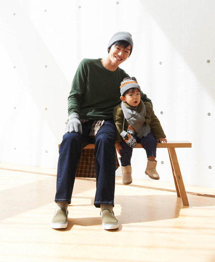 お気に入りのニット帽と手袋は、ママのお見立て。パパもぼくも、すごくあったかいよ
