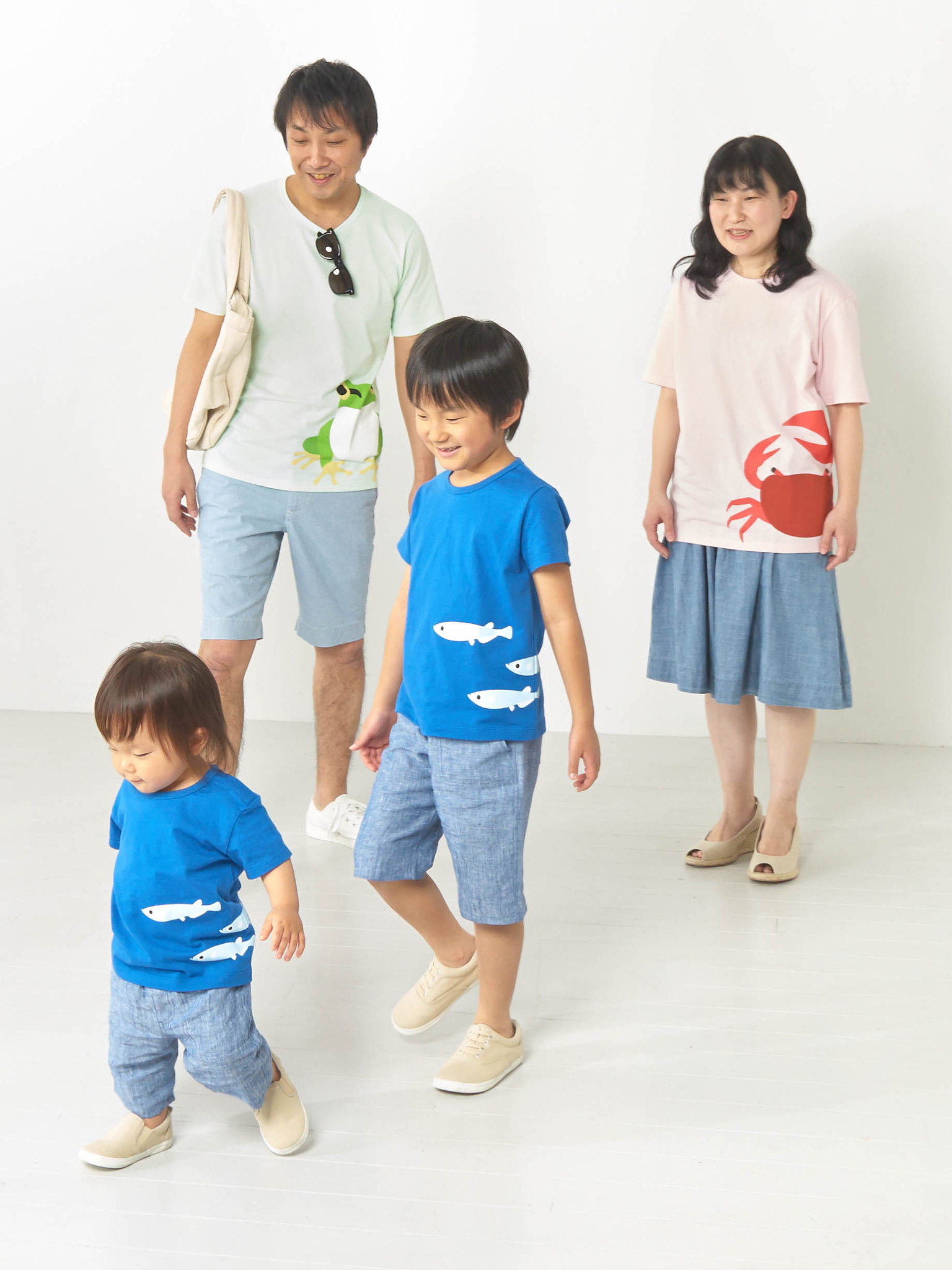 みんなでキャンプに行くんだよ!このTシャツのめだかさんみたいに、泳げるようになれるかな?