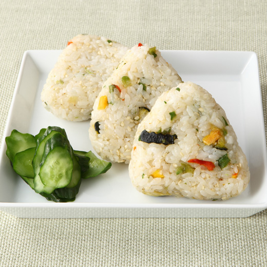 夏野菜チップをつかったおにぎり 材料 素のまま 夏野菜チップ1袋 米2合 塩2つまみ 和風だしの素小さじ2分の1 ※味を見て加減する つくり方 炊き上がったお米に夏野菜チップを少々くだき、塩、だしの素を加えておにぎりにする。