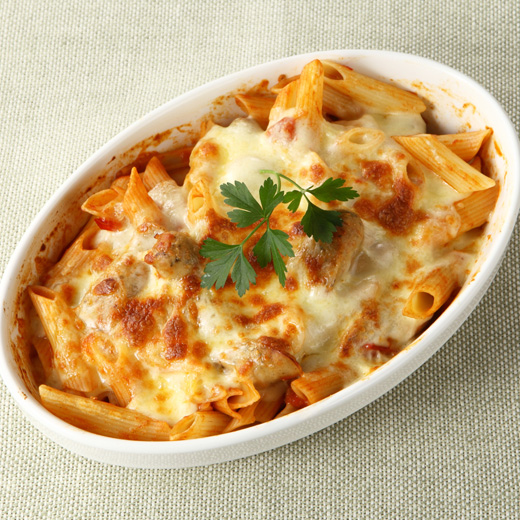 - 1に2を加えてざっくり混ぜ、耐熱容器に移す。バジルの葉を手でちぎり上に散らす。溶けるチーズをその上からかける。オーブントースターで5分焼く。(チーズの溶け具合や焼き色で加減)