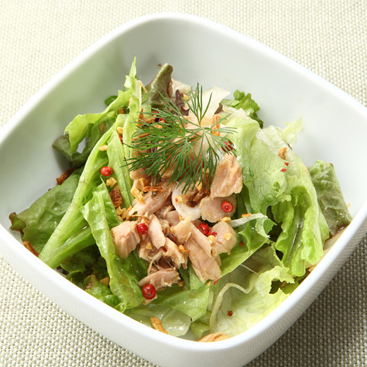 ツナとレタスのサラダ 材料 カルパッチョの素 ツナ缶(小)1缶 サニーレタス1/4個 たまねぎ1/4個 つくり方 サニーレタスは冷水にさらす。パリッとしたら水気をふき取り、適当な大きさにちぎり、ボールに入れる。 たまねぎは薄切りにして、5分程度冷水にさらす。水気を切り、塩をして、10分置く。水気をしっかりと絞り、1に加える。 ツナ缶を加える。(オイル付けの場合は、オイルを適度に切ってから加える。) カルパッチョの素を加えて和える。 トッピングを振りかける。