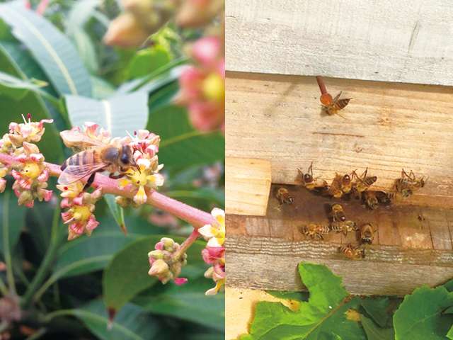 さらに長北ファームの特徴として、受粉の媒介にミツバチを使用している点が挙げられます。マンゴーの花が咲き始めるとハウス内に巣箱を置き、餌の世話や温度管理など、養蜂家さながらに面倒を見ることで、ミツバチが快適に活動する環境を作り出しています。