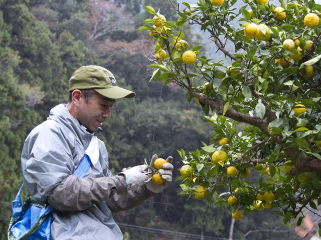 秋の収穫期になるとゆずが色づき、イチョウが紅葉し、村中が“黄金色”に輝く「木頭地区」。「私たちが木頭ゆずを世界に発信し、知ってもらい、味わっていただき、そして木頭ゆずでみんなに潤って欲しい。そんな思いで日々ものづくりをしてます」と「黄金の村」の神代晃滋さんは語ります。