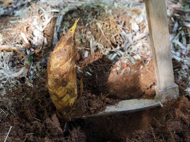 「合馬たけのこ」の生産には、ある程度水分を含んだ赤土の粘土質が必要なため、縦横無尽に広がる地下茎に赤土を10cm程被せて育てます。地下茎から出たタケノコの芽が土の表面に出て日光を浴びて色が黒ずみ堅くならないためです。