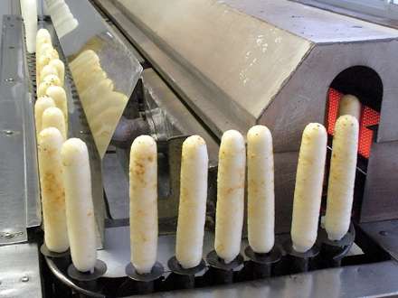 コンベアで1列に並べられたきりたんぽたちはゆっくりと家の形のようなトンネルの中に入っていき焼かれ、一周してこんがりと綺麗な焼き目がついてトンネルから出てきます。