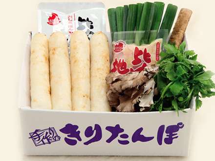 「うちの手づくりのきりたんぽは何と言っても肉厚で煮くずれしないのが特徴なんです」。しっかりもっちりしたきりたんぽの食感に味が染み込んでいました。鍋の具材も秋田県内あちこちから届けられます。(ごぼうは青森から)