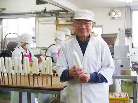 炊きたてのお米をすり潰し、1つ120g程度の団子状にしていきます。そこから1つ1つ手作業で秋田杉の棒に巻きつけていきます。