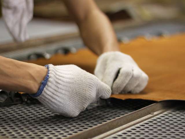 ピッグスキンは日本で自給できる唯一の革素材であり、国内市場に出回るピッグスキンの9割以上を、現在も墨田区のタンナーが手掛けているといいます。牛革と比べて薄くて軽く、摩擦にも強く、通気性が良いのがピッグスキンの特徴です。