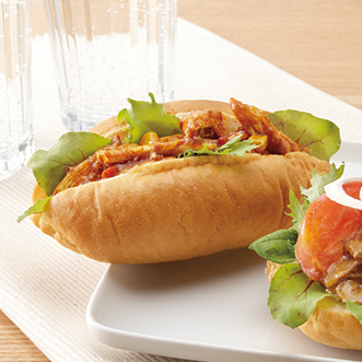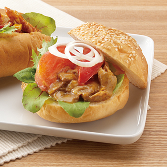 - ロールパンを切ってベビーリーフ、 牛肉カレーの炒め物、 トマト、たまねぎの順で乗せて完成。