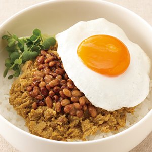 - 空のフライパンに納豆をパックからそのまま取り出し、付属のタレをかけ、両面こんがり焼いたらカレーの上に盛る。