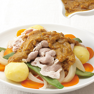 - 鍋に湯を沸かし、沸騰したら(A)を入れ、豚肉を加えてさっとゆで冷水に取る。